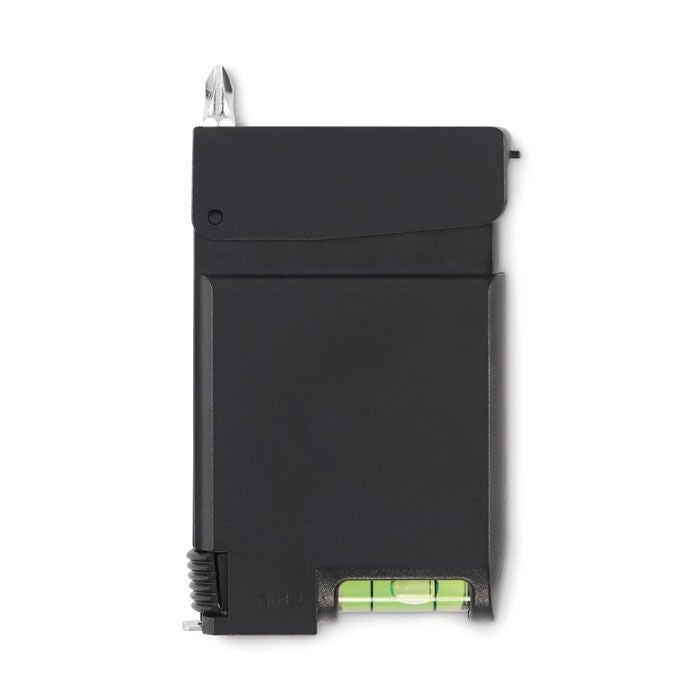Multifunktionales Rollbandmaß mit Wasserwaage und Schraubendrehersatz mit 5 Bits. ABS mit Details aus Bambus. 3m. (Die Wasserwaage ist KEINE Präzisionswasserwaage).
